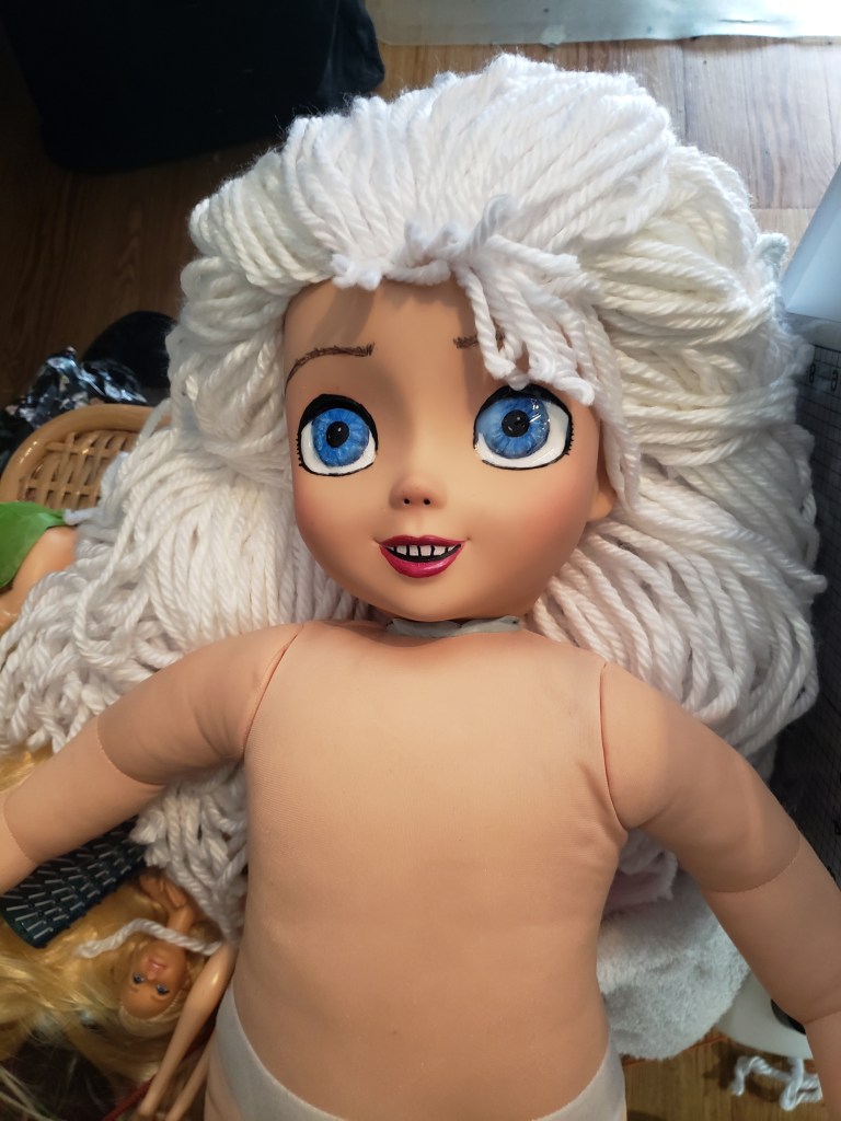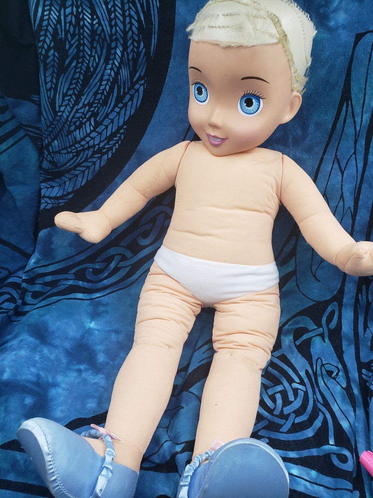 I have been thinking for a while, that I need to do a “making of” video, but it is a LOT of time to take on something, and if I were watching it, I would rush through to the parts I thought were most important. But I am a writer, or was before my muse died, and I can take pictures 🙂 So let me take you basically through the steps of a 2ndlifedolls OOAK custom doll. I put step one as the basic doll once I removed her hair and actually rememberd this would be a good time to take a picture, but obviously, I went to the Thrift store and found this Cinderella doll first. She had a roughed up dress and her hair was pretty raggedy. She was in my doll bin as a possible remake/upcycle, so when I got the commission to make a custom Elsa for a <5 year old girl, I decided the Cinderella would do just fine, and if I didn’t get it right, I could always try a smaller doll.