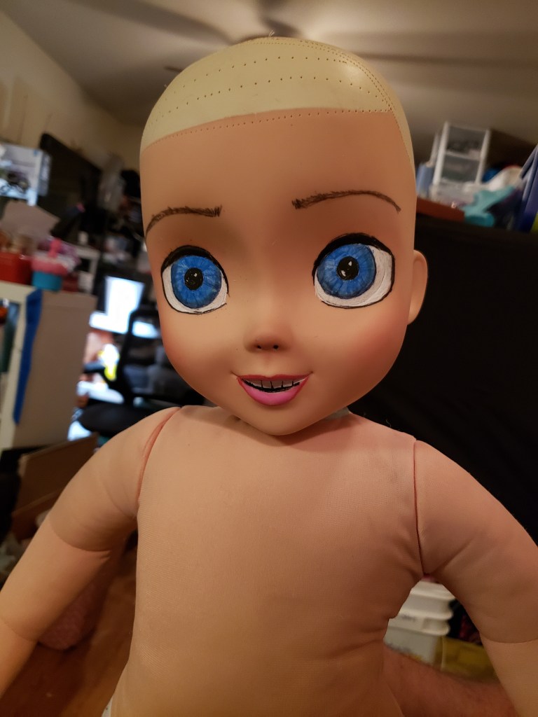 Next, I had to make some big blue Elsa eyes. Disney has Princesses with very big eyes, and I didn’t want the eyes to look like the store bought, so I made them a little bigger and outlined her mouth and drew in some new brows. You can see the mold of her eyes in this, but with the glaze, I knew that would diminish.