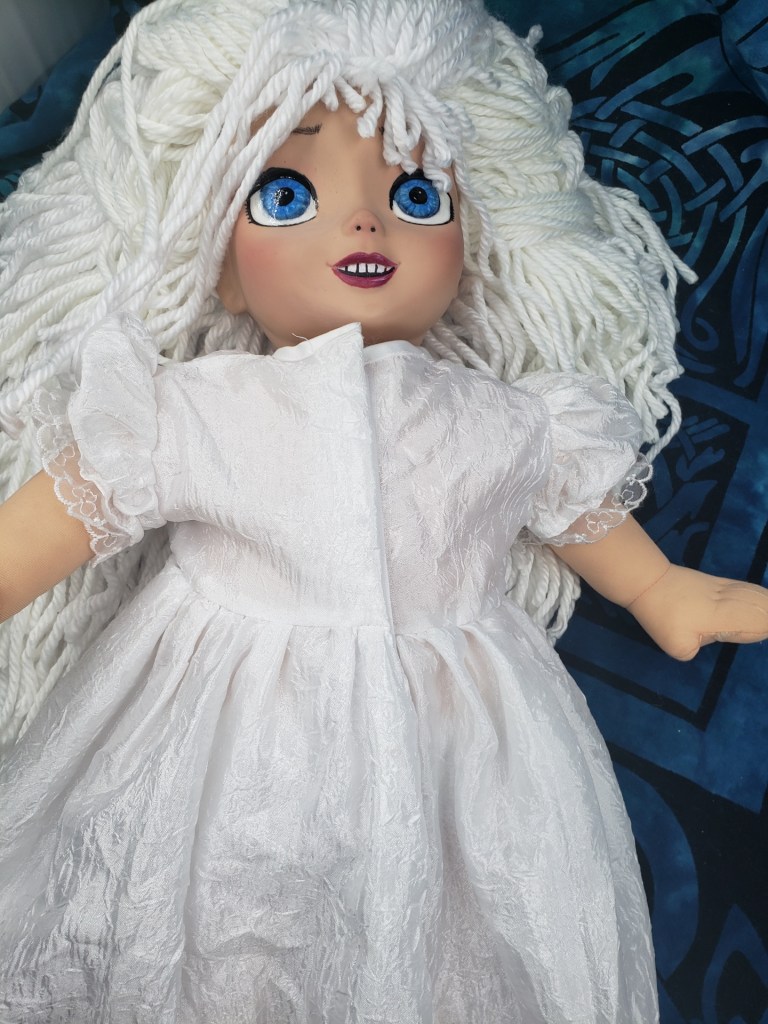 Now she’s all done and ready to wrap and ship…. which will cost a lot, because it’s a big doll, but someone’s daddy is willing to pay for a one of a kind doll that will keep their little girl warm at night.